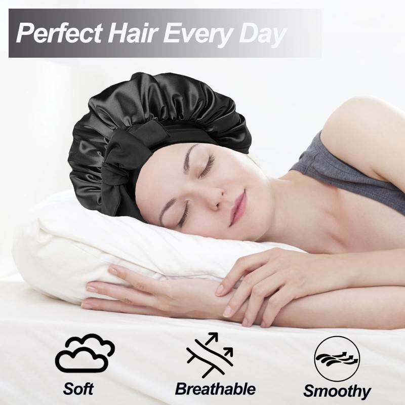 • Our black bonnet for sleeping is designed with premium satin, which will make your hair frizz-free and tangle-free by reducing friction between your hair