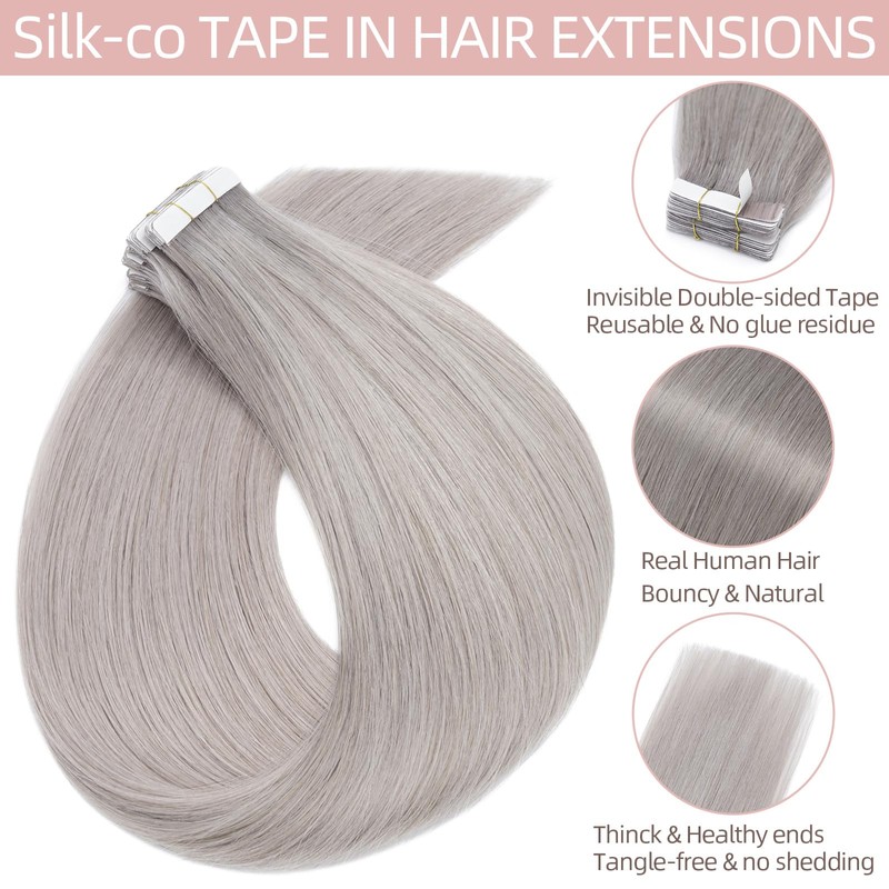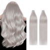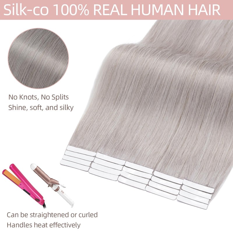 Silk-co Grey Tape in Hair Extensions Human Hair #Grey 40pcs Remy Real Hair Seamless Straight -Skin Weft- 80g/Set