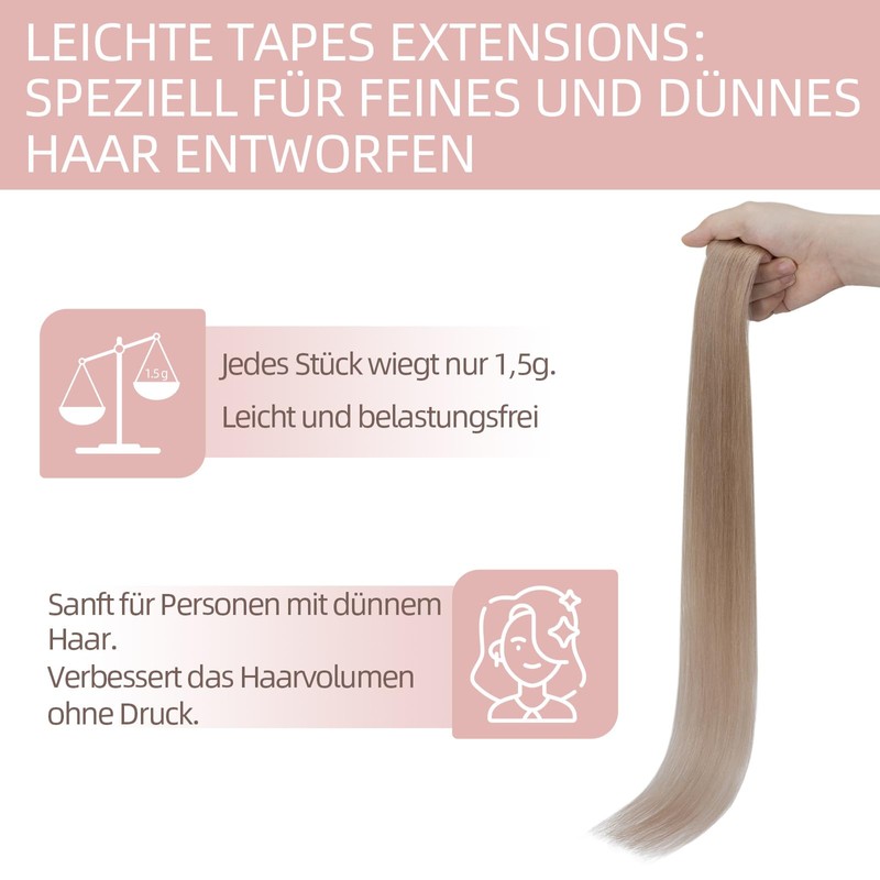 • Effortless installation with tape-ins: our real hair tape extensions are made with high-strength, invisible tape and can be easily installed by peeling and sticking - even for beginners. You save time and money on the hairdresser and the extensions are gentle on your own hair. They can also be reused by simply replacing the old tape with new ones.