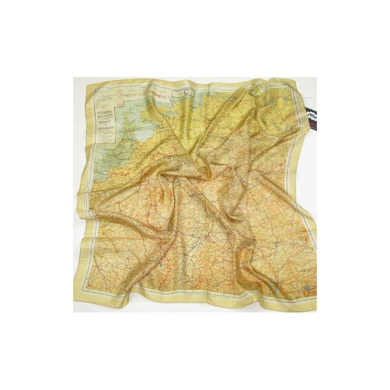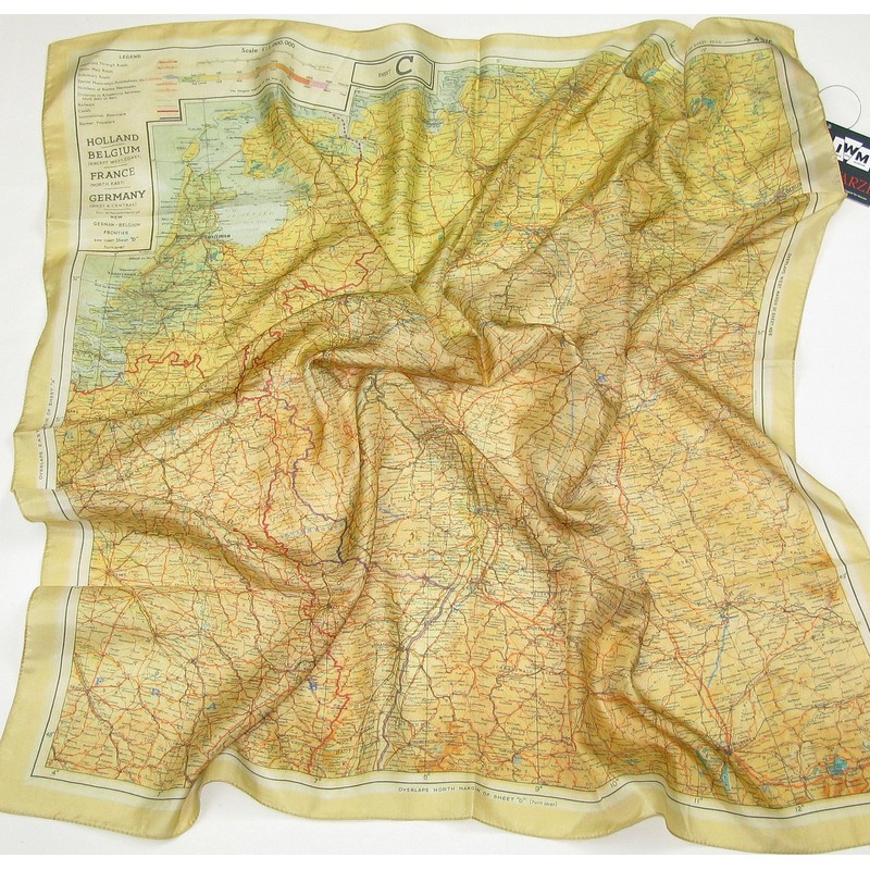This authentic silk scarf with an escape route map will match any dress. He showed a map of Holland, Belgium (except the west coast), France (northeast) and Germany (West & Center).
