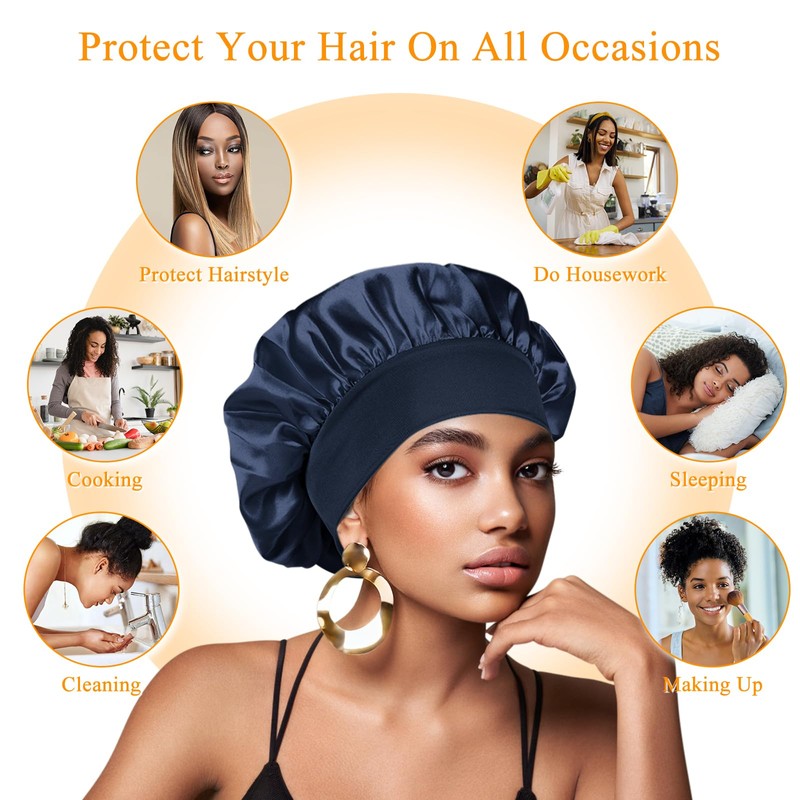 Silk Hair Wrap Sleeping,Silk Bonnet Hair Bonnet Sleeping, 1pcs Night Sleep Cap silk Bonnet Girls, Hair Care sleeping Head Cover Elastic Hat Hair Bonnet Black hair Curly Hair (Navy Blue)