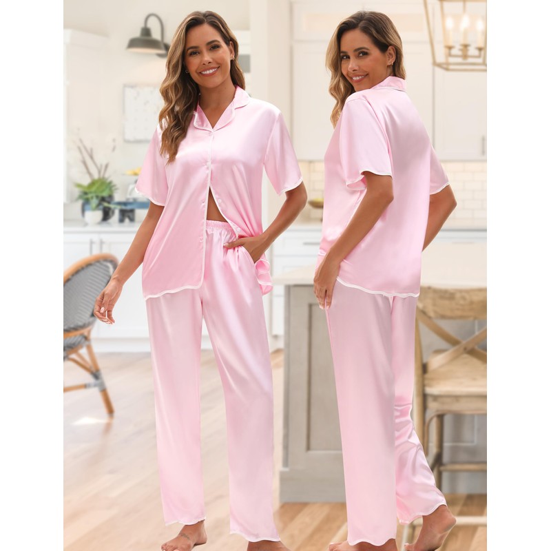 - Easy Care with Style: The short sleeve pajama set for women is machine washable and easy to maintain. With a relaxed silhouette, contrast trims, and thoughtful details like a button down pajamas women design and elastic fit, this womens satin pajama set blends everyday practicality with timeless elegance