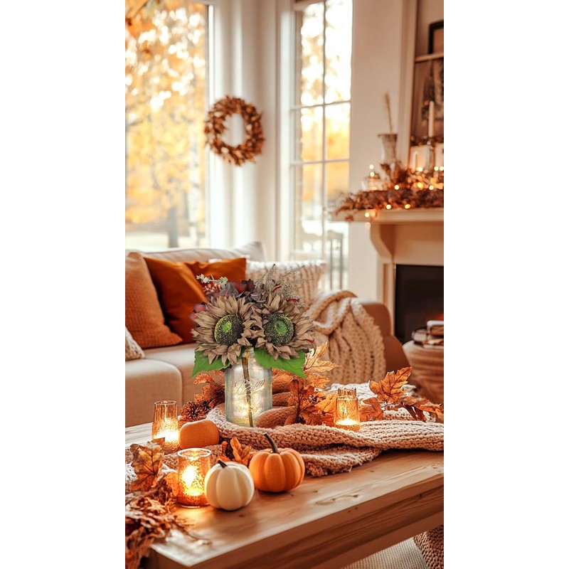 - Autumn Decorations for Home - Effortlessly elevate your seasonal ambiance! Designed for Harvest Festival, Thanksgiving, rustic wedding decor, and general fall decorating.The stylish mason jar complements any color scheme, while the silk flowers maintain their vibrant appeal through changing seasons. Perfect for enhancing your living room, kitchen, bedroom, mantel, dining table centerpiece, coffee table display, entryway console, front porch, office desk, shelf, or retail store