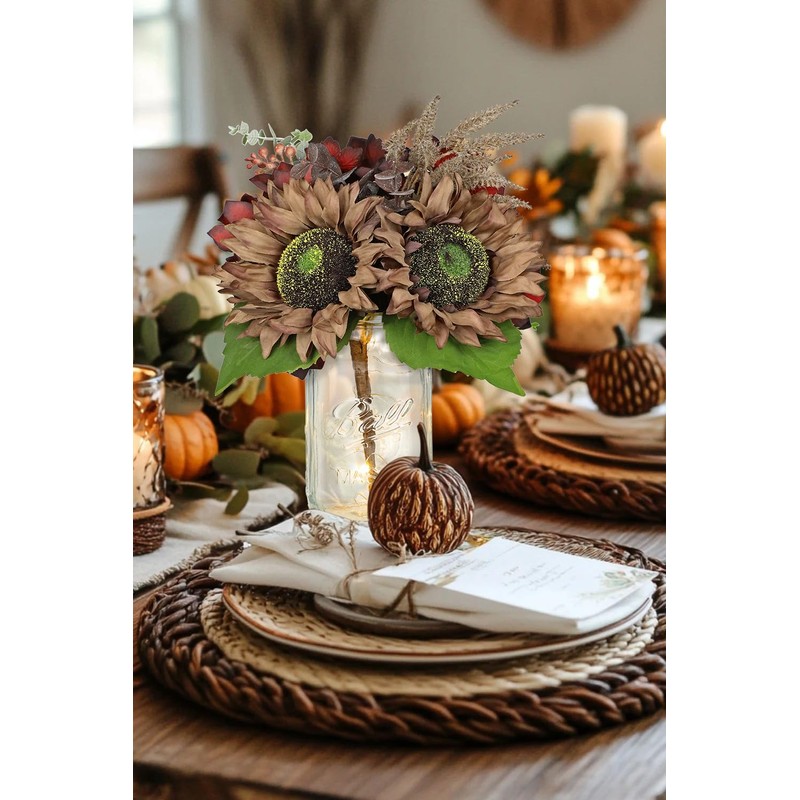- Mason Jar Centerpieces - This fall centerpieces for tables features lifelike brown sunflowers with green yellow centers, complemented by deep red peony blooms, frosted eucalyptus leaves, and natural textured wheat stems. Each silk petal showcases delicate veining for authentic realism. The sunflower bouquet is securely placed in a classic glass mason jar, creating a perfect farmhouse autumn centerpiece for Thanksgiving, harvest festivals, or seasonal home styling