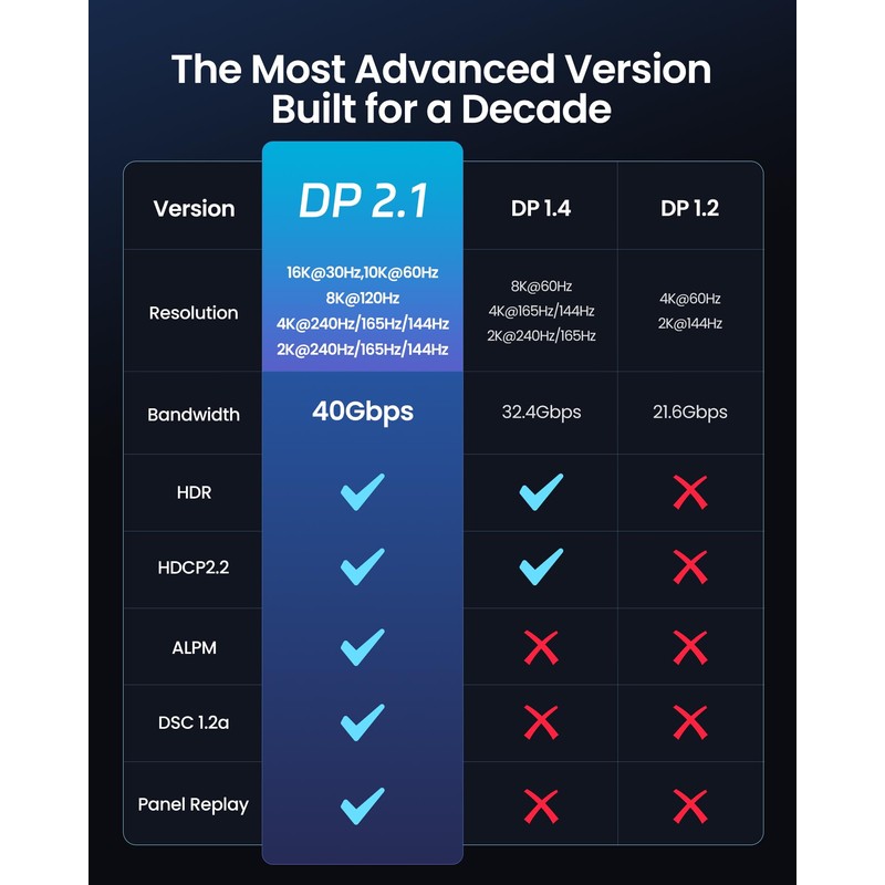 - 【VESA Certified 16K DisplayPort Cable 2.1】Silkland 16K Displayport Cable 2.1/2.0 supports high resolutions 16K(15360*8640)@60Hz with DSC, 8K@120Hz, 4K@240Hz/165Hz/120Hz/144Hz, 2K@360Hz. Silkland 16K DP 2.1 Cable certified by the VESA Association. Supports Dynamic HDR, HDCP 2.2, DSC1.2a. Backwards compatible with DisplayPort 2.0 1.4 1.3, 1.2, 1.2a, 1.1 and 1.0. Support flawless audio pass-thru for uncompressed digital audio channels at 7.1, 5.1 and 2.0. Support 3D stereo imaging technology