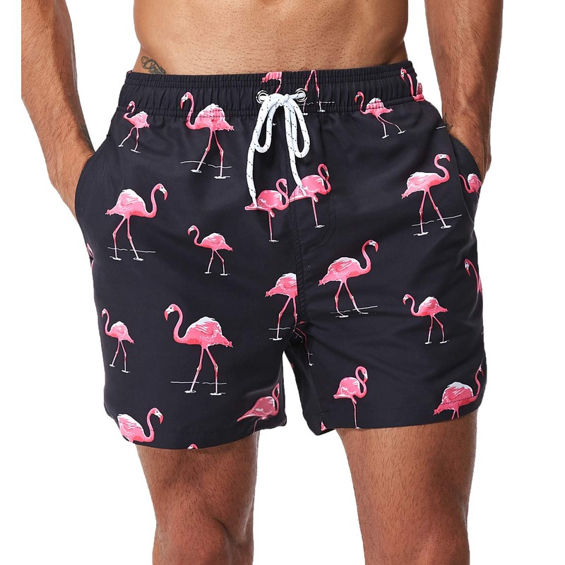 SILKWORLD Mens Swim Trunks Quick-Dry Printed Swim Suit Shorts Mesh Lining, Pink Flamingo, XX-Large