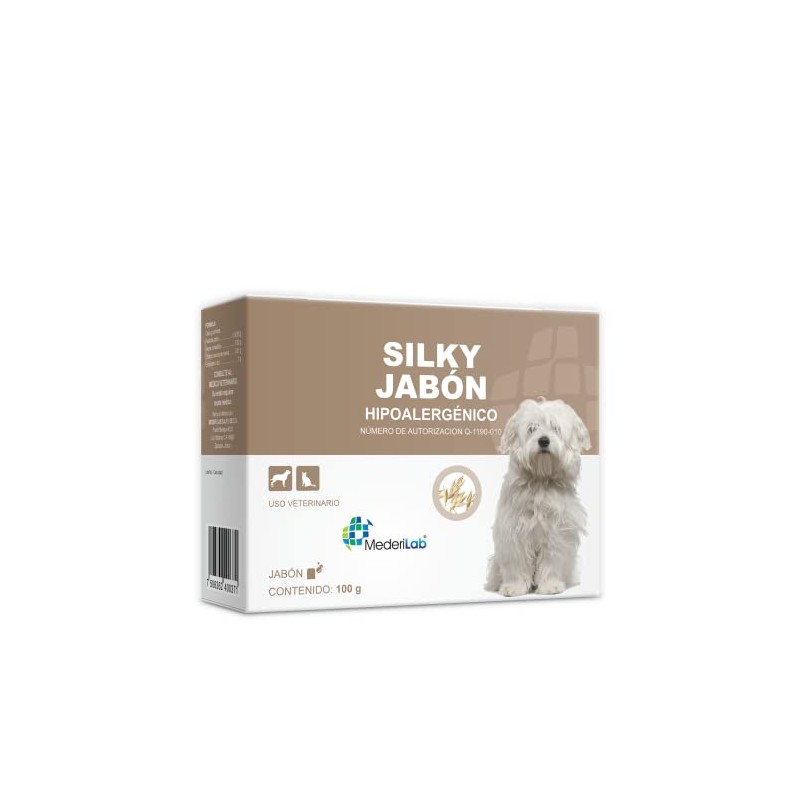 SILKY JABÓN Hipoalergénico 100 g. Formulado con extracto de avena que promueve la higiene y el cuidado de la piel, dejando una apariencia con un pelaje sedoso y brilloso. Puede ser utilizado para el baño de cachorros. Cuenta con agradable aroma.