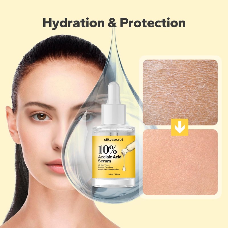 - Hydration & Protection: SilkySecret 10% Azelaic Acid Serum is not just for treating imperfections but also for nourishing the skin. Sodium Hyaluronate and Glycerin deeply hydrate while Tocopherol (Vitamin E) delivers antioxidant protection, helping to slow down signs of aging. Designed for all skin types, including sensitive and oily skin, this serum is lightweight, absorbing quickly to leave skin soft, hydrated, and protected throughout the day.