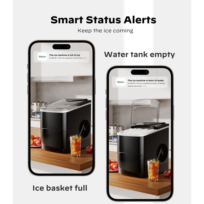 - Control Using the Silonn App: Take full command of your smart countertop ice maker using the Silonn mobile app. Connect via Wi-Fi to control and monitor your ice maker to start or stop ice production, adjust ice cube size, and receive notifications when the water needs to be refilled.