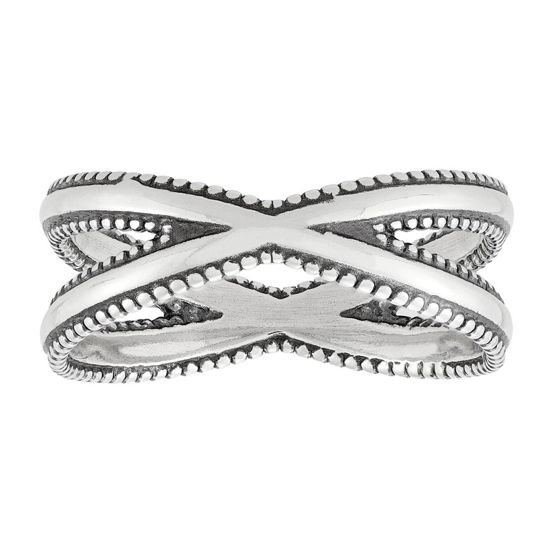 - Embrace a bold look with this edgy ring. It combines a crisscross design with intricate beaded edges. The intersecting bands create a striking pattern, while the textured beading adds depth and flair. This ring is a perfect blend of chic and eccentric. The piece comes with a “.925” sterling silver quality stamp as a symbol of guaranteed product quality.