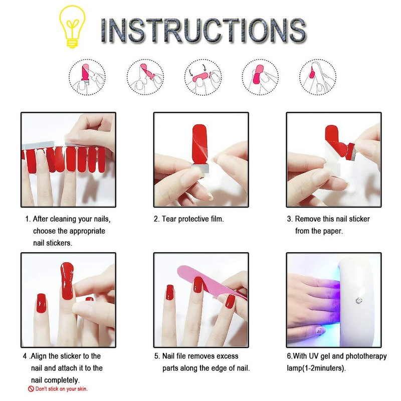 **PACKAGE CONTENTS:** ▶ 1×14 sheets nail polish stickers ▶ 1×1 pc nail file **FEATURE:** ▶ 100% nail polish ▶ No drying time ▶ No mess ▶ No smudges ▶ Long-lasting **INSTRUCTIONS:** ① Trim and clear nail (using rubbing alcohol) , clean edges cuticles and polish surfaces. ② Apply a base coat or clear nail polish and allow to dry. ③ Compare your fingers with the nail sticker and choose the best size for your nails. ▲SMALLER IS BETTER THAN BIGGER ④ Tear off the transparent covering, stick the sticker to the nail, and press it properly.(the stickers stretchable) ▲ Notice:DO NOTTOUCH THE BACK SIDE OF NAIL DECALS TO AVOID THE OIL OF SKIN AND LEAVE A BIT SPACEBETWEEN NAILS WITH CUTICLE ⑤ File off excess (top down) and be sure that none of the sticker extends beyond the fingernail. ⑥ Apply clear nail polish and allow to dry. ⑦ Done! **MATTERS NEEDING ATTENTION:** ① Do not touch water within three hours. It is recommended to use it at night. ② Leave a bit space between nails with cuticle, do not apply on cuticle and skins. ③ Use with base coat and topcoat.