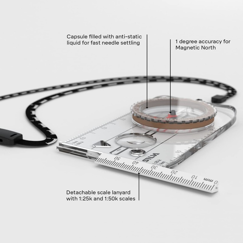 - Silva only use highly durable acrylic plastic. The blend has a lot of transparency which increase the map visibilty and ensures quicker navigation. The scales and other information on our compasses are hot stamped, which makes them exceptionally durable. On all Silva compasses, the direction accuracy for Magnetic North is 1 degree. Comes with a safety cord with scales. The size of the base plate is 11.5 x 6 x 1 cm.