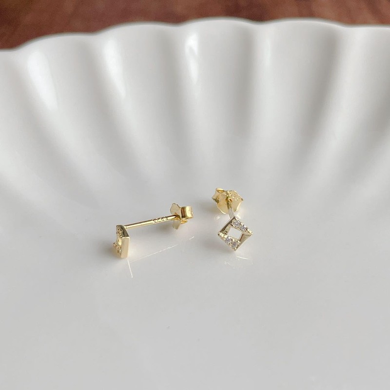 Silver 925 Hypoallergenic Square Tiny Mini Stone Earrings, Yellow Gold, Cubic Zirconia