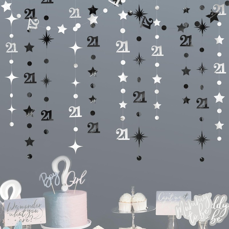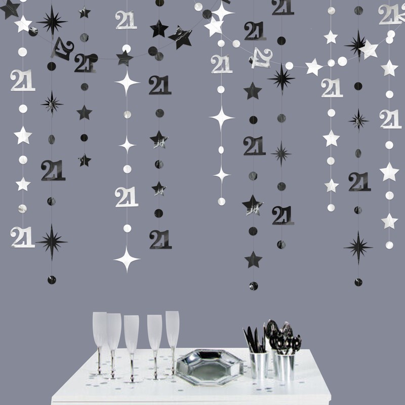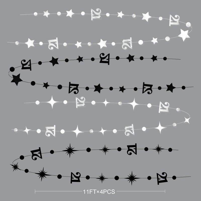 • Package includes - 4 strings of 11.5 feet/3.5 meters metallic silver black number 21 sparkling twinkle star and circle dots garlands , totally is 46 feet/14 meters.