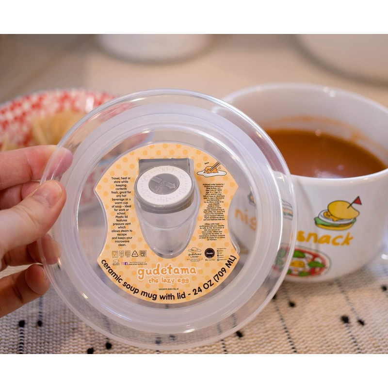 - Taza de sopa: Disfruta de esta taza de sopa de cerámica Gudetama de 710 cc con una tapa ventilada. Esta taza cuenta con Gudetama y algunos deliciosos bocadillos nocturnos Guarda fácilmente tu sopa extra con esta taza de sopa con una tapa