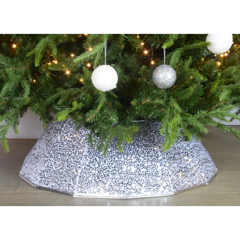 • Size - Width (base) 65cm (25.6 in), Width (top) 40cm (16 in), Height 27cm (10 in). The flared design of this silver sparkly Christmas tree skirt covers the legs of a tree stand but also helps create a nicely shaped and visually pleasing base area for your tree. At this height you will be able to cover the base of an artificial tree stand with this silver tree collar and if you've got a real tree in a stand, you'll be able to gain access to add water.
