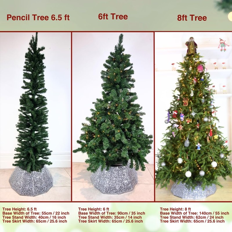 • Tree Sizes - For artificial trees this tree skirt is suitable for most 6ft trees, 7ft trees, 7.5ft trees and a tree skirt for 8ft tree. For 9ft and 10ft trees you should measure the width of your Christmas tree stand to ensure that it fits in the 65cm (25.6 in) tree skirt base. For 6ft-10ft real trees it works with most popular tree stands. You need 25.4cm (10 in) of space from the ground to the first tree branch for easy installation. For trees smaller than 6ft or thin pencil style trees it's possible to reduce the diameter of the stand by double folding some of the sections and securing with one of the plastic clips instead of the integrated fastener (this increases height to 28cm/11in).