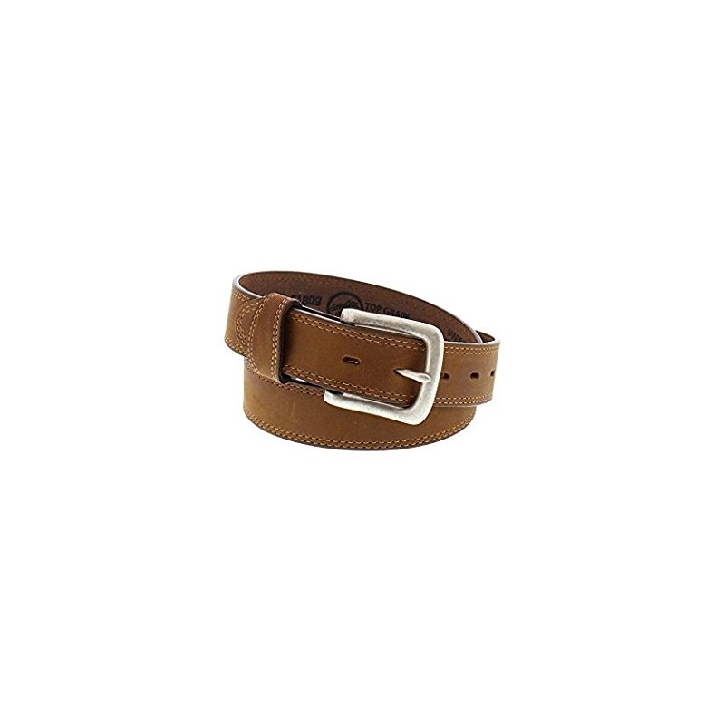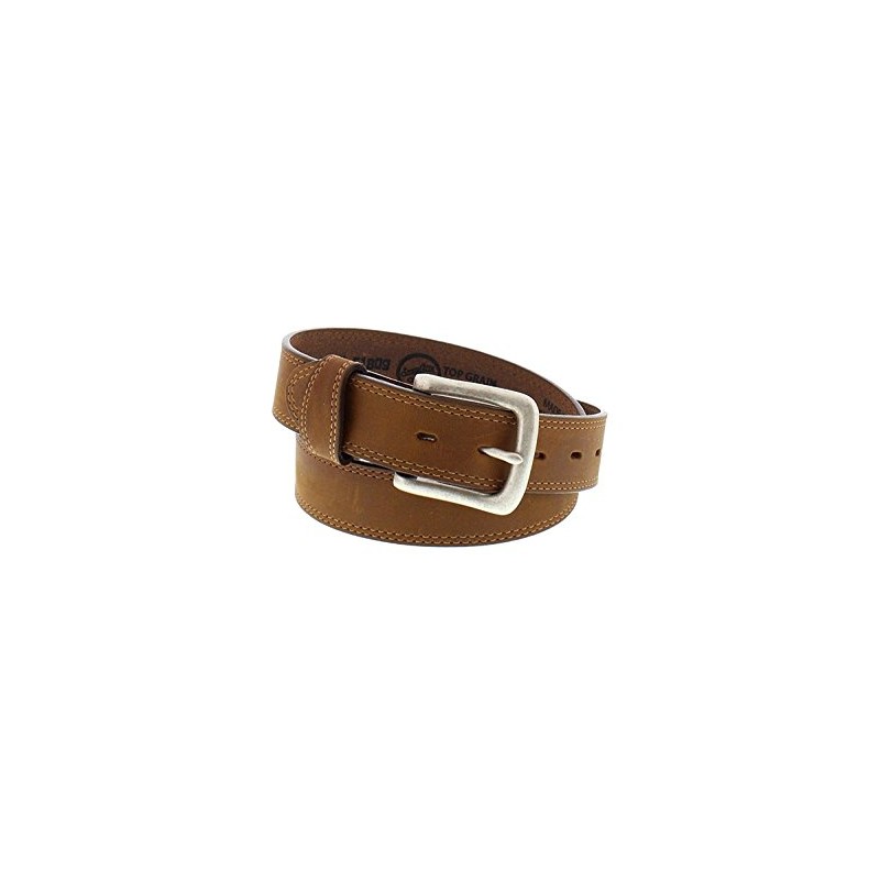 Style number: 51809. Brown leather belt. Double stitch detail. Silver plated belt buckle. Suggested to order one size larger than your typical pant waist size.