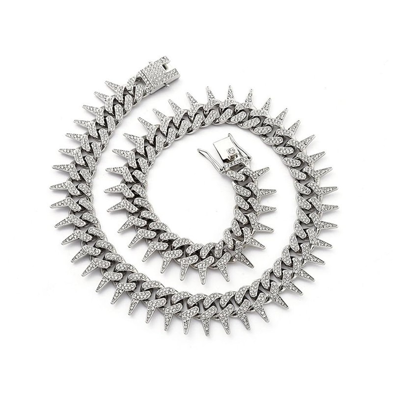 Silver Dog Chain Collar, Side Spiked Style Necklace Bling Diamond Cuban Link Dog Collars Glitter Rhinestone Puppy Collar for for Small Medium Large Pet Dogs Cats, 22-Inch