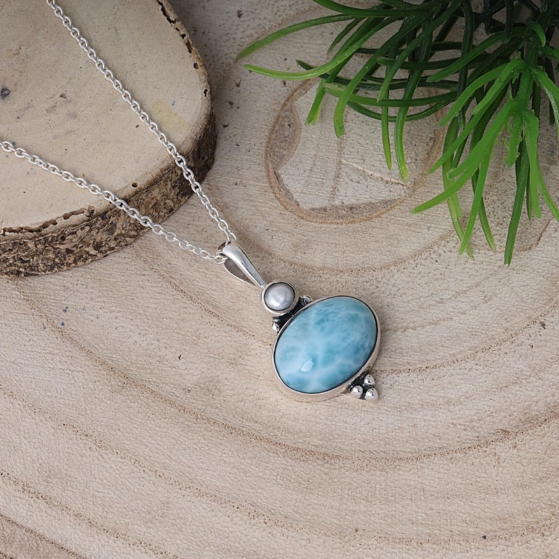 Natural Larimar Pearl Pendant Necklace crafted from 925 sterling silver. This delicate necklace features a beautiful Larimar stone in an oval shape, accompanied by a lustrous round pearl, both set in cabochon cuts for a classic look. The pendant hangs gracefully from a 16+2 inch silver chain, offering versatility in wear. With its dainty design and captivating blue hues, this necklace adds a touch of elegance to any outfit. Perfect for women who appreciate timeless jewelry with a touch of sophistication. Product weight with chain: 5.5 grams, pendant size: 1.1 inches.
