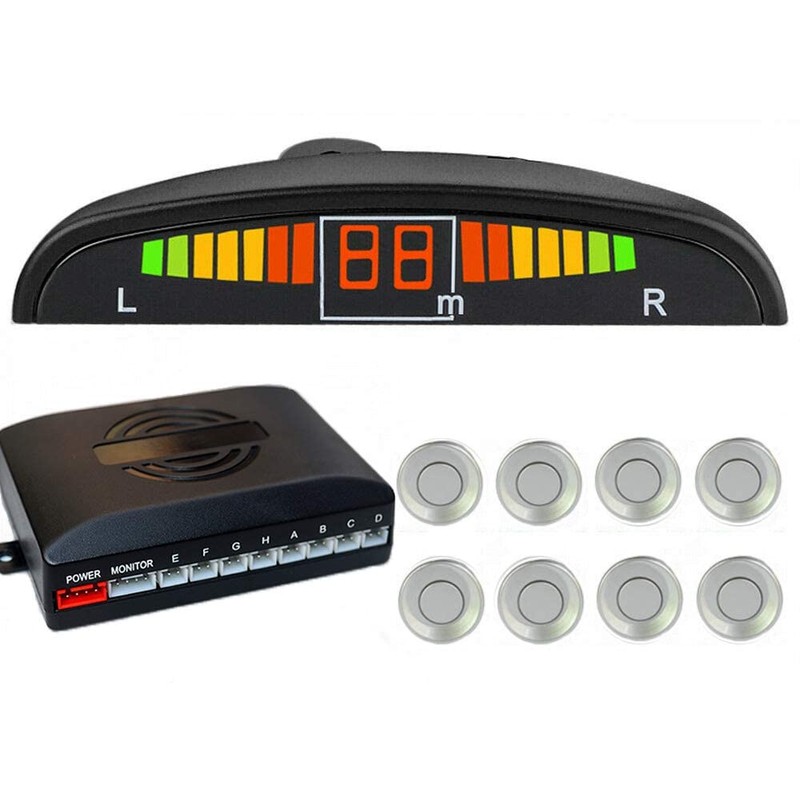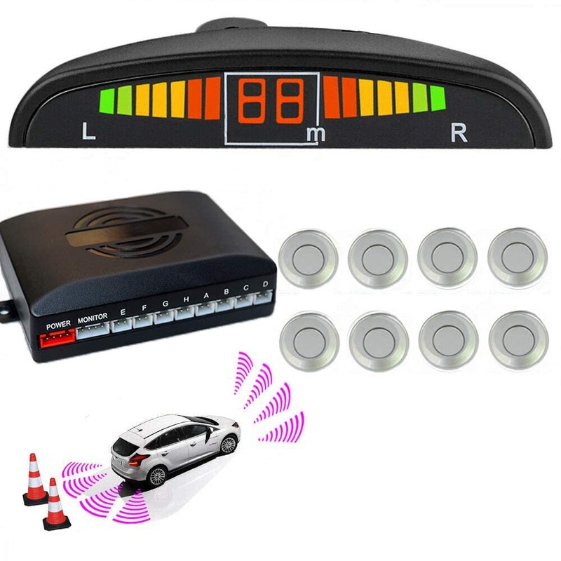 Silver Front and Rear 8 Sensors Car Reverse Parking Rader Kit LED Buzzer Alarm Front Rear Reverse Parking Rader Kit LED Buzzer Alarm