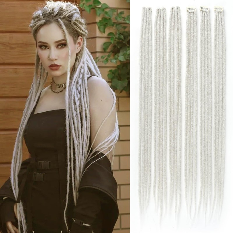 Silver Grey Clip in Dreadlocks Hair Extensions 24 Inch 6 Clips(24strands) Handmade Synthetic Clip In Dreads Extensions for Women(Gray#)