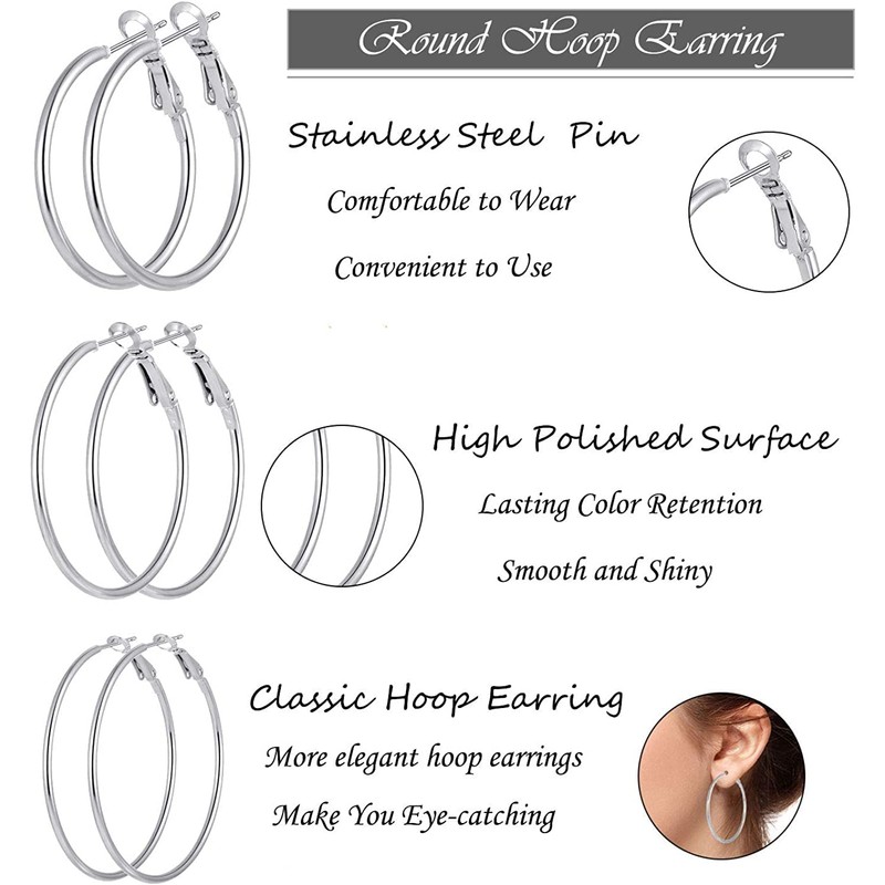 - Silver Hoops Earrings for Women-Design of round circle loop earrings, classic big hoop earrings in gold silver, make you look more elegant and charming in your life. Big hoop earrings easily fit lots of styles and can be paired with so many outfits. These large hoop earrings wear well whether you’re in the office, or out with the girls and you will receive a lot of compliments.