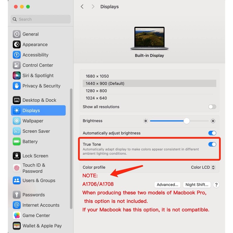 - The entire installation process may take more than 30 minutes. You will get a brightness display of 300 nits. It includes: camera (480P), normal functioning of the light sensor, normal functioning of the keyboard backlight, normal functioning of automatic and manual brightness adjustment, A1706 A1708 no true tone