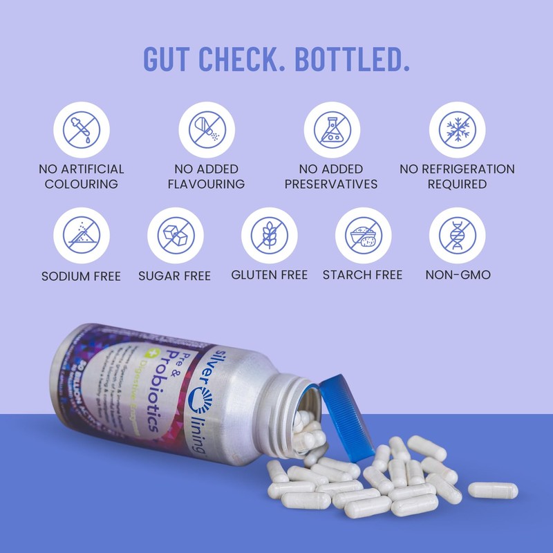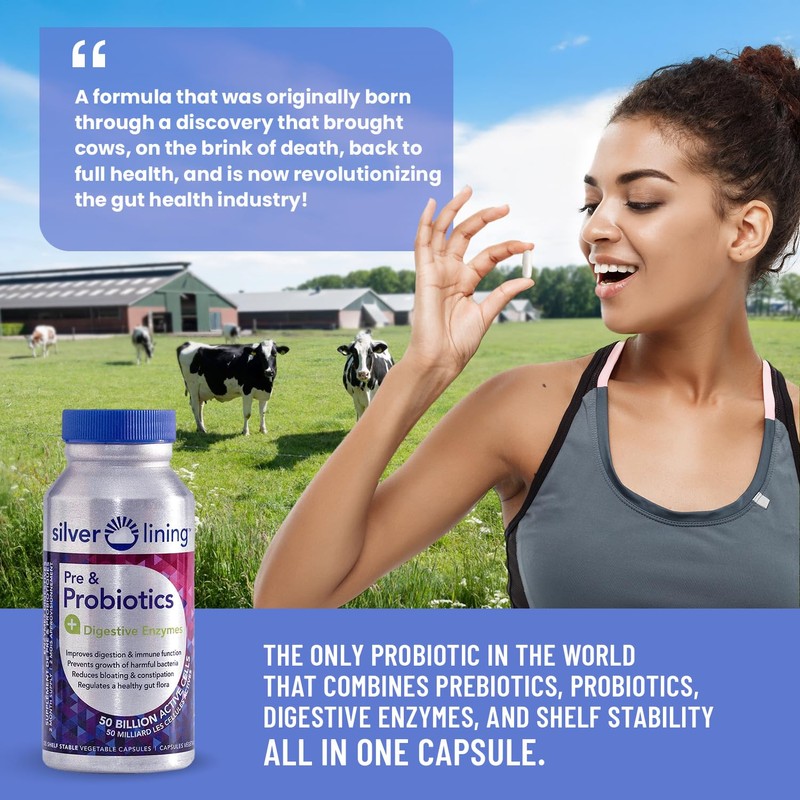 Silver Lining Pre & Probiotics + Digestive Enzymes Supplement Discover the ultimate solution for digestive health with Silver Lining Pre & Probiotics + Digestive Enzymes, an expertly crafted supplement designed to support gut health, boost immunity, and enhance overall well-being. This advanced formula combines prebiotics for women and probiotics for women in one, along with powerful digestive enzymes for men and women, to deliver comprehensive digestive and immune support for all. Packed with 50 billion active cells, including Lactobacillus salivarius, Lactobacillus gasseri, and L. reuteri strains, plus butyrate supplements and digestive enzymes like alpha-amylase, cellulase, and lipase, this supplement supports optimal gut flora balance, smooth digestion, and better nutrient absorption. Ideal for addressing common concerns like bloating relief for women, IBS, and women's probiotic pH balance, this daily solution promotes vitality and well-being. The shelf-stable formula ensures potency without refrigeration, making it a convenient choice for any lifestyle. Whether you're looking for a womens probiotic, oral probiotics, or pre/probiotic supplements, Silver Lining has you covered. Key Benefits: - Supports gut health with clinically studied probiotic strains, including Akkermansia muciniphila and S. boulardii. - Enhances digestion with premium enzymes for smoother digestion. - Boosts immunity by supporting gut health. - Reduces bloating and eases discomfort for a lighter, more energized feeling. - Convenient shelf-stable capsules with 50 billion active cells for maximum effectiveness. Perfect for: - Women seeking prebiotics and probiotics in one for pH balance and digestive health. - Individuals looking for a butyrate supplement, Lactobacillus salivarius tablets, or a trusted IBS probiotic supplement. - Those in need of a complete probiotic and digestive enzyme supplement for optimal gut health.