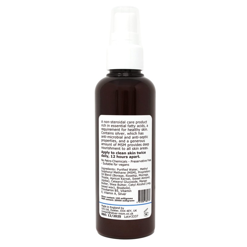 Silver MSM Dry Eczema Lotion has been developed as a non-steroidal, natural product for the care of skin prone to eczema and dermatitis. It is deeply nourishing and at the same time moisturising and skin-soothing. Effective care of skin prone to eczema requires the maintenance of a sufficient moisture level in the skin. To achieve this, the skin cells need essential fatty acids and vitamins in their membranes. The application of silver MSM lotion for dry eczema delivers it directly and in abundance: the proprietary oil blend contains large amounts of omega 3 & 6 & 9, GLA (gamma linolenic acid) with natural vitamin A (retinol) and vitamin E (tocopherol). Elementary silver and MSM form the basis of all our skincare products: silver has an anti-microbial and protective effect. Our lotion contains MicroSilver TM, a superior anti-microbial active ingredient that creates a very strong silver effect. Very effective and safe in long-term use, the MicroSilver TM particles are clinically detectable able to release active silver ions to the skin for 12 hours. MSM is the often overlooked nutrient used by skin cells for healthy renewal to form flexible, fully functional cell membranes. The use of cold-pressed oils of the highest quality further enhances the nourishing effect of this lotion. Silver MSM Dry Eczema Lotion is fragrance free. All ingredients are based on plant and mineral substances. Not tested on animals. No Petro Chemicals - No Parabens - No Phthalates. The product comes with stickers in English. Ingredients: purified water, methylsulfonylmethane (MSM), own oil blend (borretch, rose hip, moringa, thistle, apricot kernel, sweet almond, jojoba), cetearyl glucoside, mango butter, shea butter, cetyl alcohol (vegetable wax), bisabolol, provitamin B5, vitamin E, vitamin A, silver