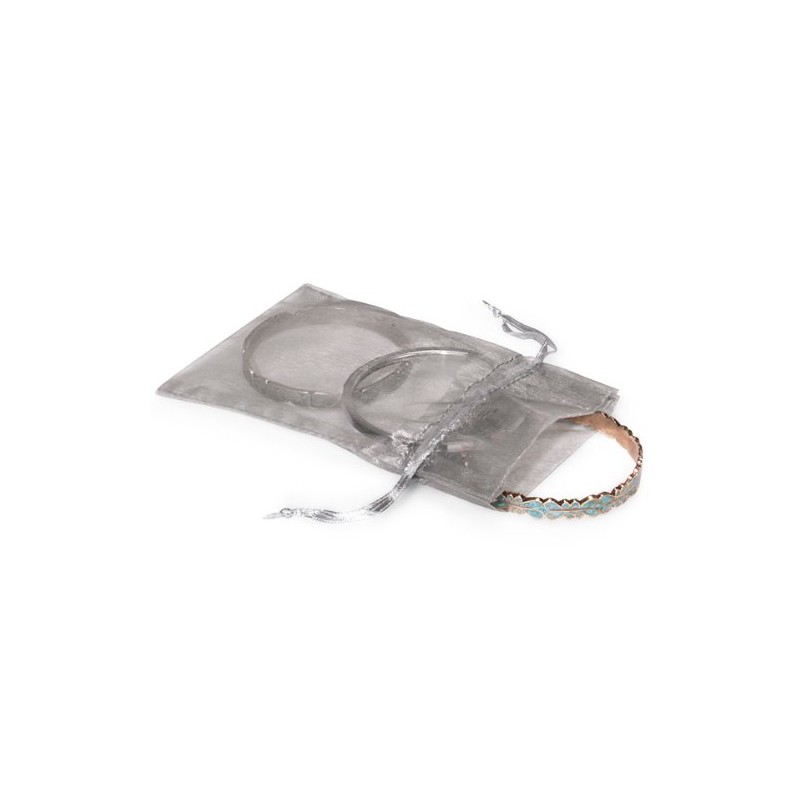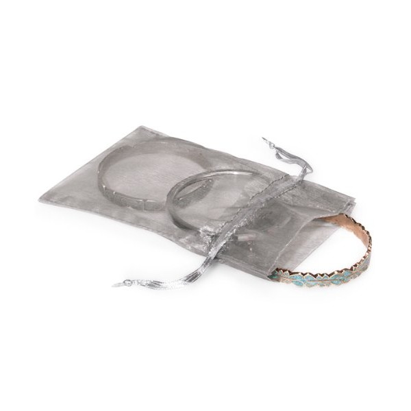 • Silver Sheer Organza Bags with silver satin drawstrings.