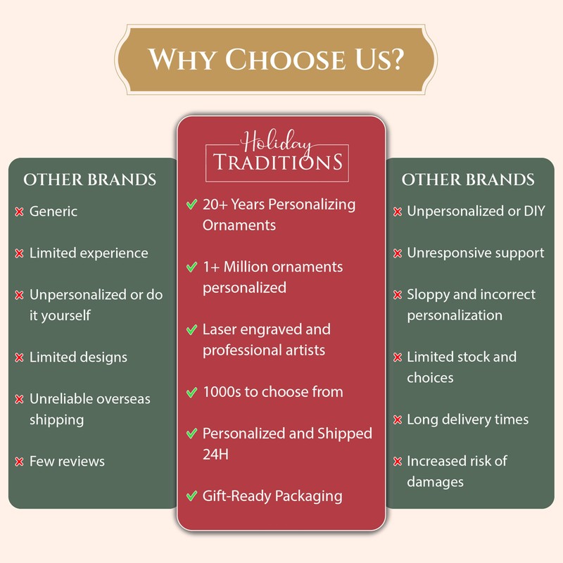 Thanks to our 24-hour personalization and dispatch service, your custom tree ornament will arrive quickly. Perfect for decorating your tree or gifting as a cherished keepsake. Plus, our fantastic customer support team is dedicated to ensuring your experience is just as wonderful as your personalized ornament, making Holiday Traditions the trusted choice for families wanting to create unforgettable holiday moments.
