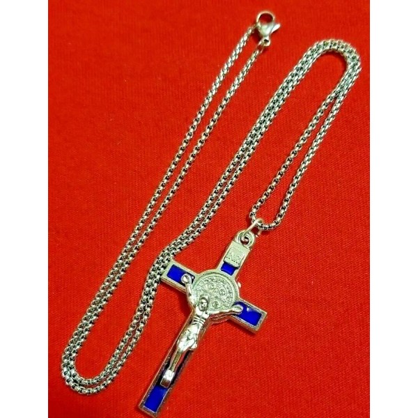 Silver PLATED CROSS with blue enamel 2 inches and 24 inches CHAIN