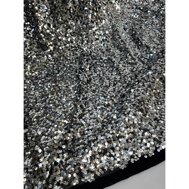 SILVER Sequin/Sheer Stretch Black Mesh on Silver Sequin/Sequin for Prom-Per Yard