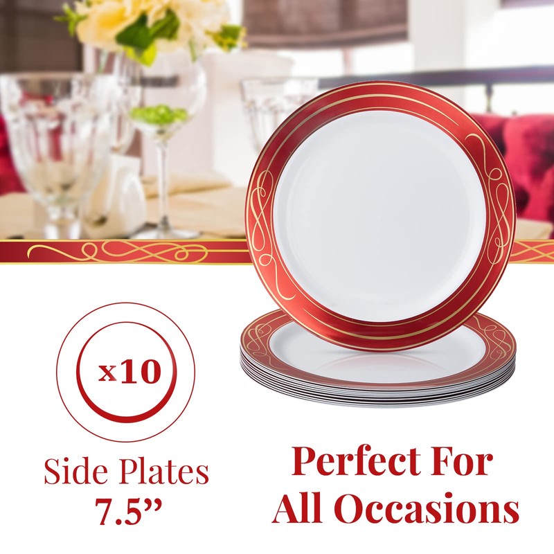 SILVER SPOONS Elegant Disposable Plates For Party - (10 Piece) Heavy Duty Disposable Dessert Set 7.5”, Fine Dining Plastic Dishes For Elegant China Look, Great Upscale Celebrations & Events, Red