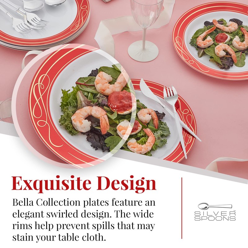 - ELEGANT YET AFFORDABLE: With this dazzling set of disposable tableware you get the look of high-end plates, at an affordable price. Bring your party to a higher level without compromising on quality and reliability with this elegant Bella Dinnerware set