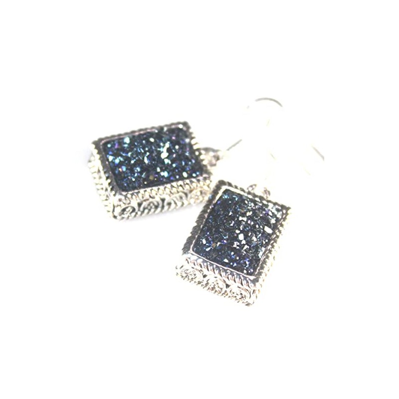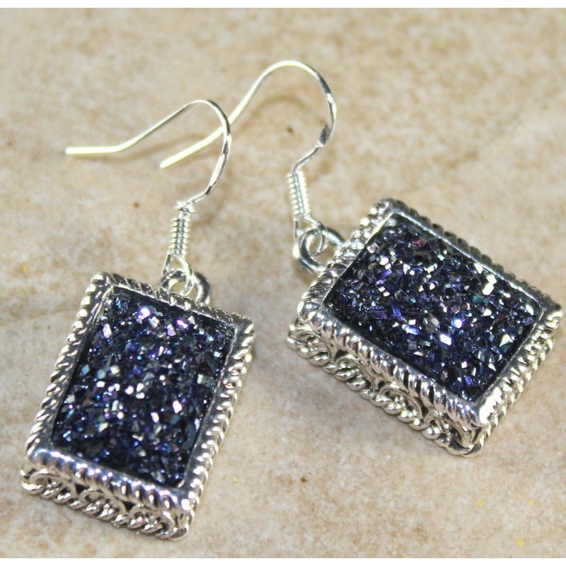 SILVER Vintage Style Ocean Blue Rainbow Titanium Druzy Rectangular Earrings