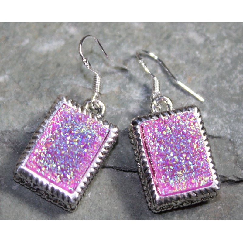 SILVER Vintage Style Pink Rainbow Titanium Druzy Rectangular Earrings