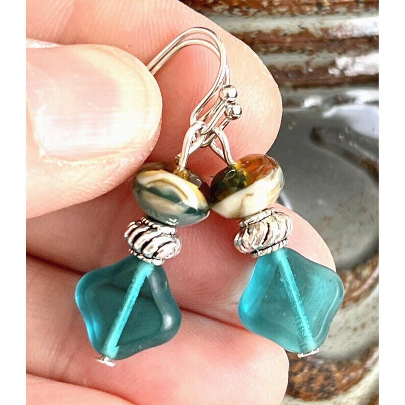 Silver with Frosty Teal and Amber Czech Bead Dangle Earrings