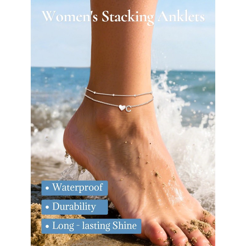 SILVERCUTE Sterling Silver Anklets for Women, Waterproof Initial Heart Ankle Bracelets Adjustable Layered Foot Chain