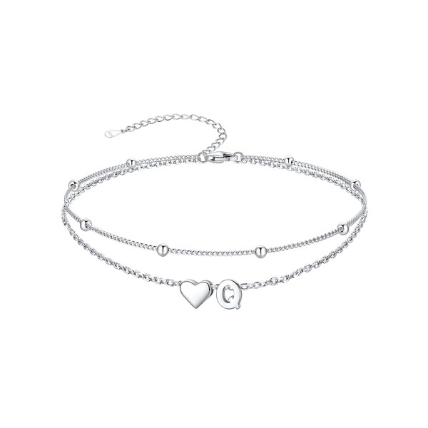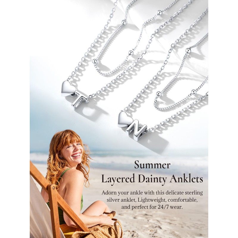 SILVERCUTE Sterling Silver Anklets for Women, Waterproof Initial Heart Ankle Bracelets Adjustable Layered Foot Chain