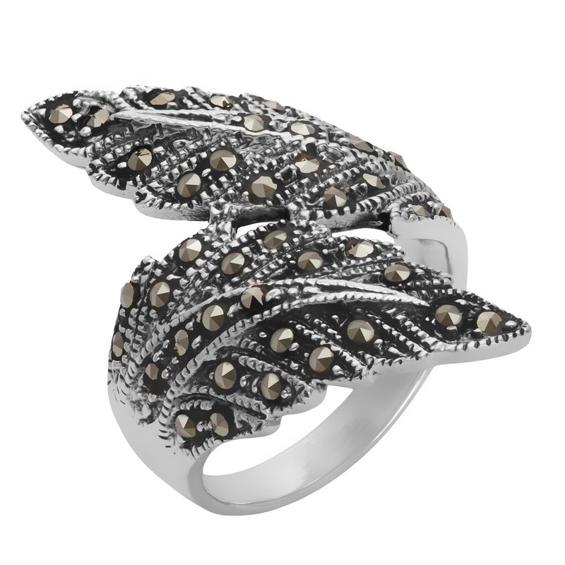 Silverly Women's .925 Sterling Silver Simulated Marcasite Oxidised Overlapping Feather Ring