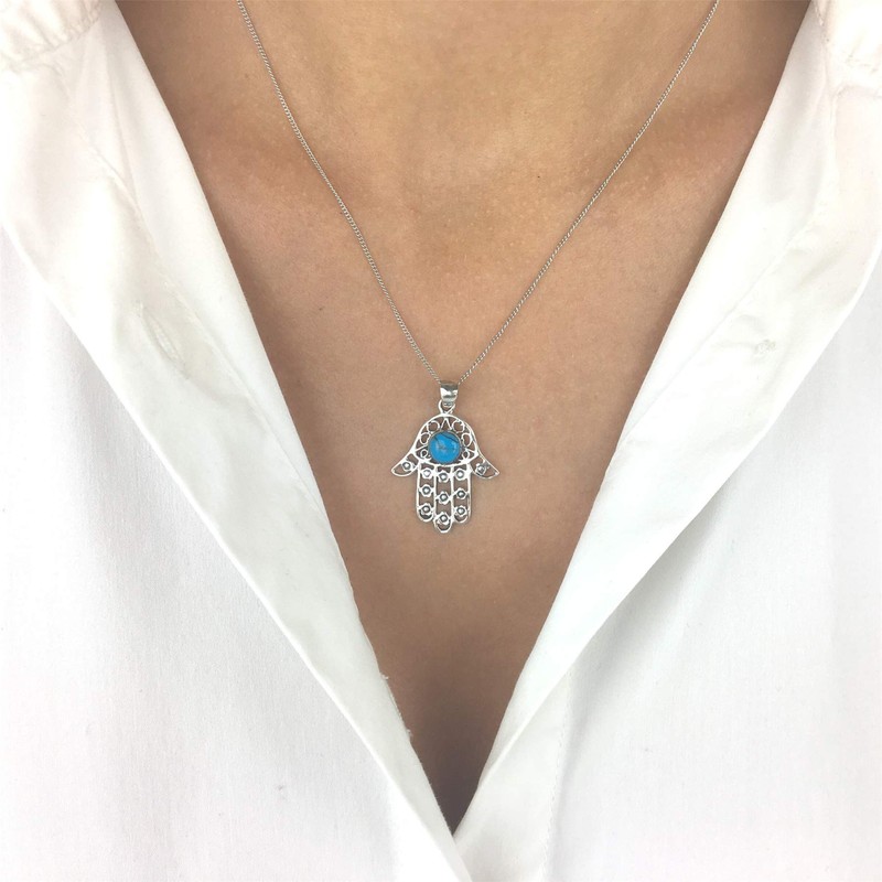 Silverly Women's .925 Sterling Silver Simulated Turquoise Hamsa Hand Pendant Necklace, 46 cm
