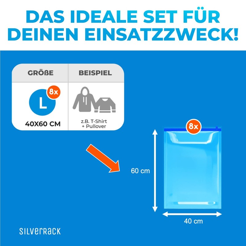 - Perfect set size: with the SilverRack vacuum bags in the sizes 70 x 50 cm, 60 x 40 cm and 50 x 35 cm, you have the perfect set for swimwear, underwear or seasonal clothing: fresh travel clothes safely stowed away