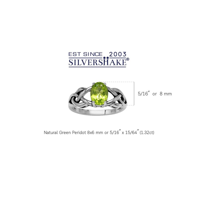 - Silvershake 1.32ct. 8X6mm Natural Oval Shape Peridot 925 Sterling Silver Celtic Knot Solitaire Ring; is shipped to you in anti-tarnish protection inside reinforced gift boxes with satin-style pouches; guaranteed beyond competitors