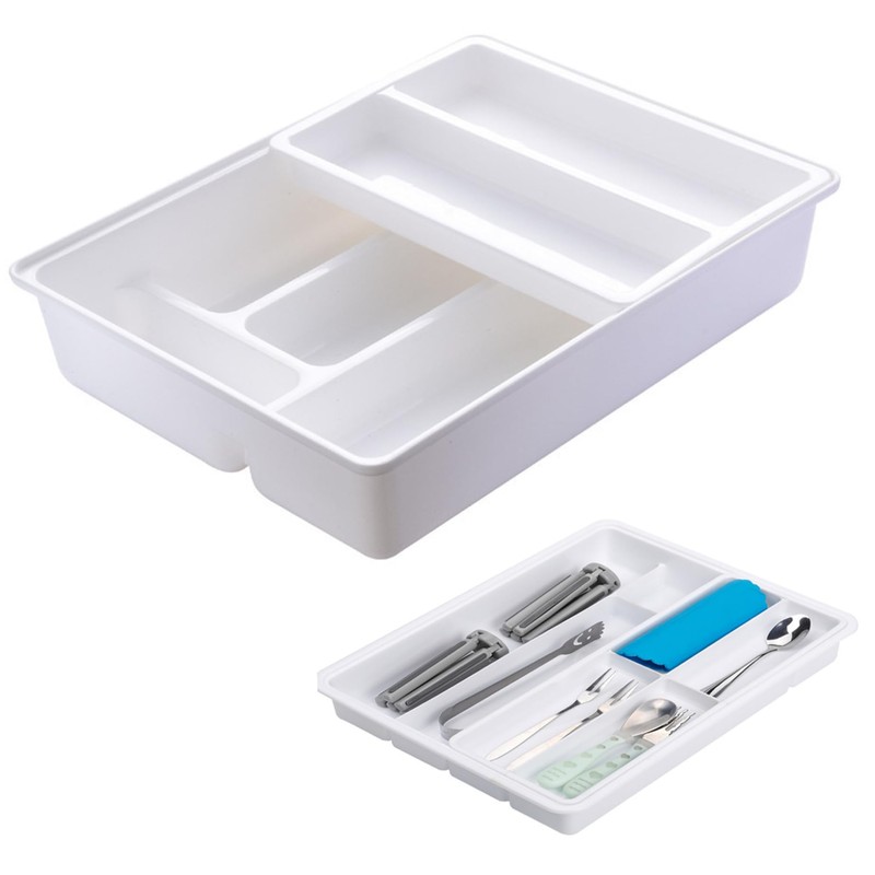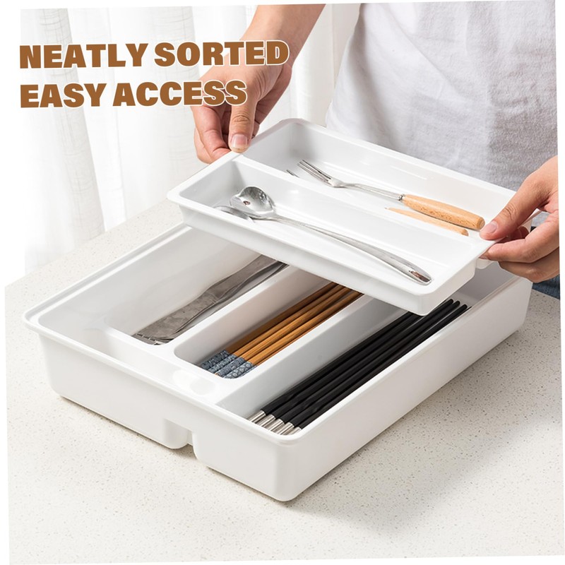 Upgrade your kitchen storage with this 2-layer silverware drawer organizer, designed to help you keep your utensils neatly sorted and easily accessible. Featuring a space-saving design with a slidable and removable top tray, this organizer provides two tiers of customizable storage, allowing you to separate cutlery and other tools without mess. The smart grid layout ensures that forks, spoons, knives, and even specialty items each have their own place. Crafted from sturdy white plastic, it complements any kitchen decor while standing up to daily use. Its smooth surface is easy to clean, making it both practical and hygienic. The 10x12x2 inch size is ideal for fitting into standard drawers, maximizing space while reducing kitchen clutter. Whether you're organizing everyday silverware or hosting utensils, this drawer organizer adds both structure and style to your kitchen routine.