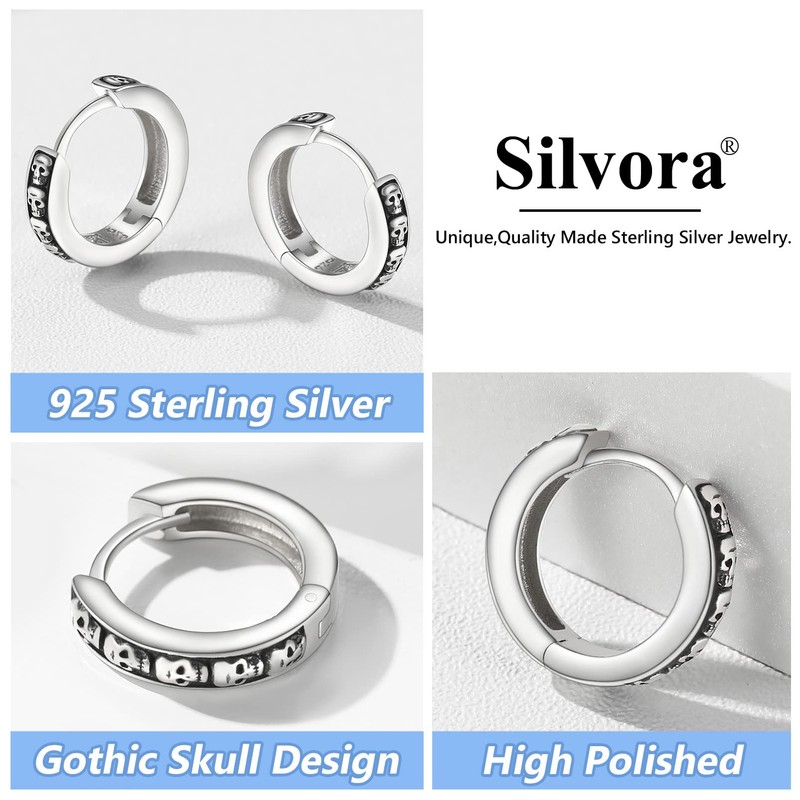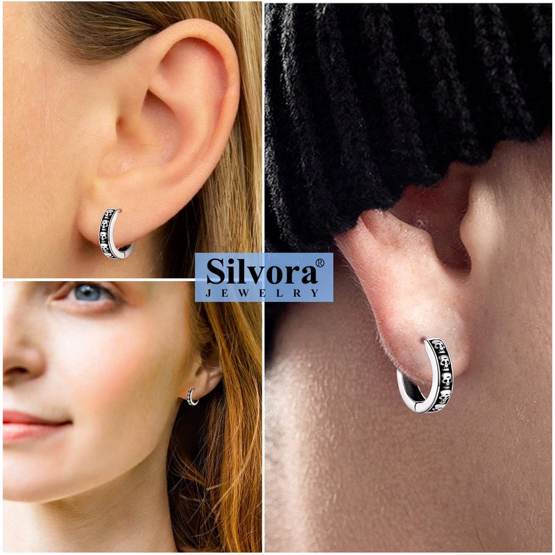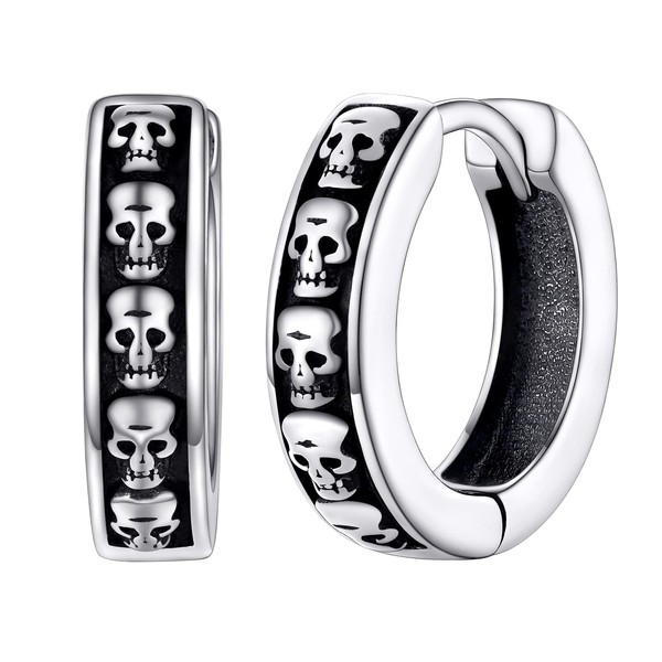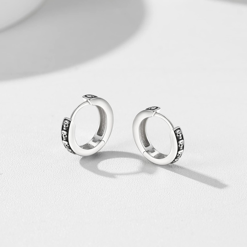 Silvora Gothic Earrings for Man Woman 10mm Punk Skull Hinged Huggie Hoop Earring Solid Silver Ear Jewelry