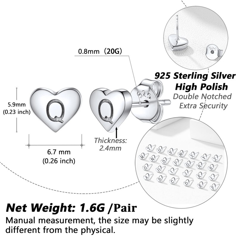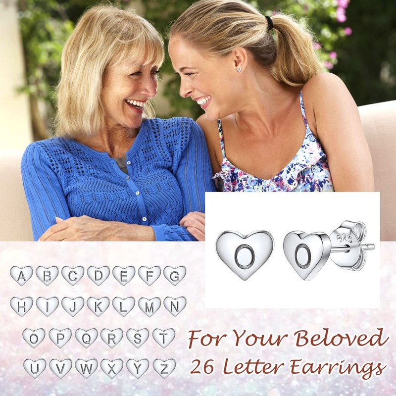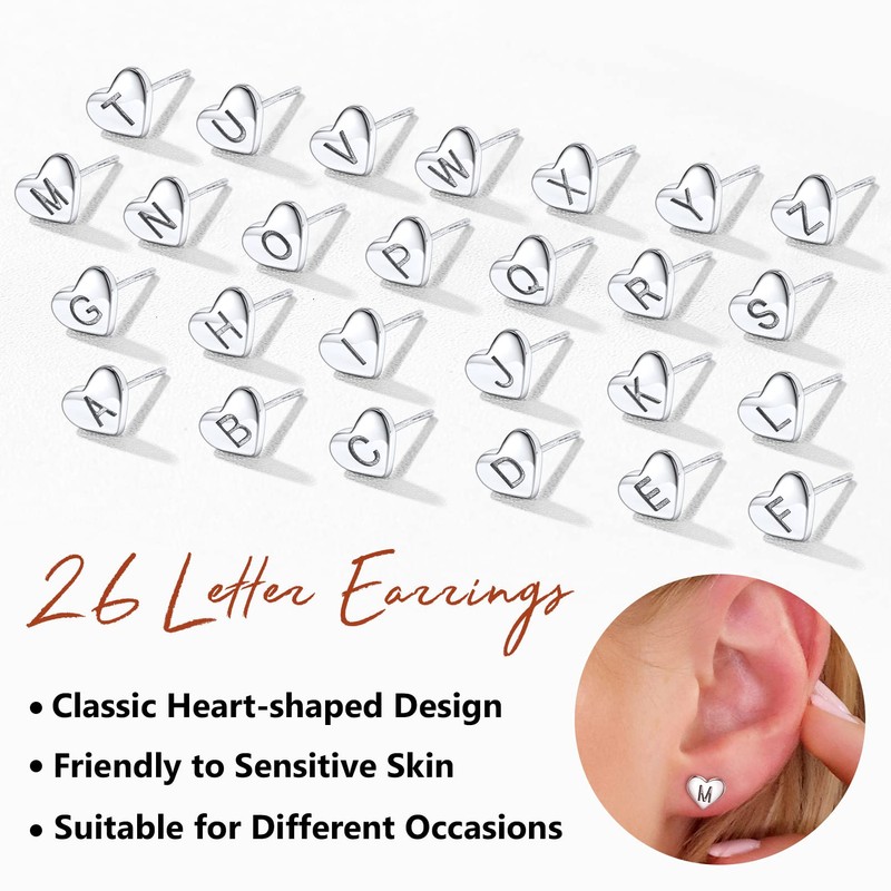 • đź’–Heart Shaped Letter Earrings --- Womens silver initials studs with S925 stamp, allergy-safe, nickle-safe, lead-safe, skin-friendly ear jewellery, earring size: 6.7mm*5.9mm(0.26”inch*0.23”inch), needle size: 0.8mm(20G), weight: 1.6g/pair, really small size and lightweight, comfort fits.