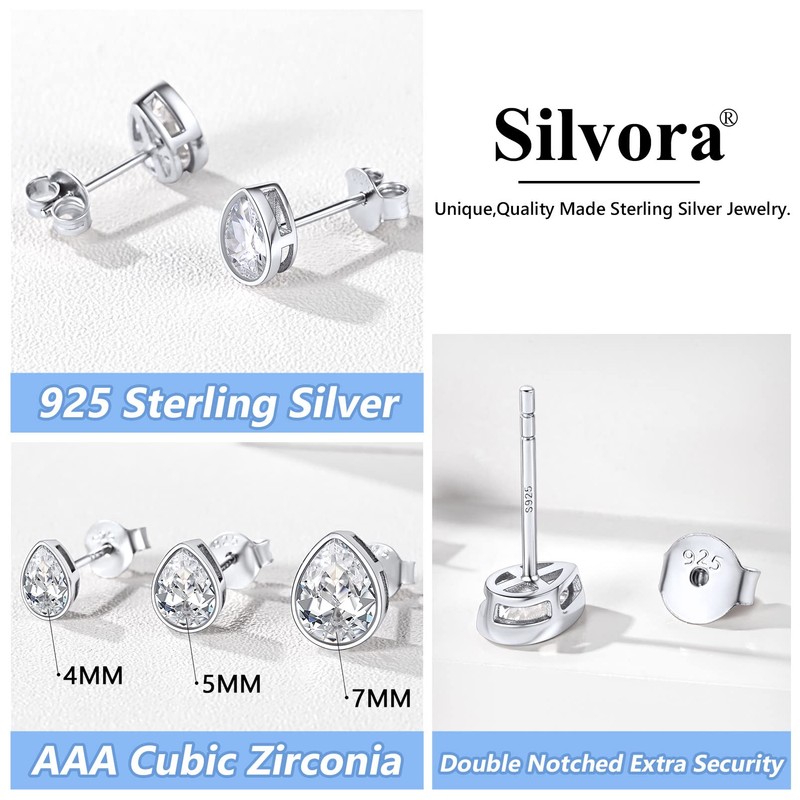 Silvora S925 Silver Cubic Zirconia Earrings, Sparkling Teardrop Shape/Rectangular/Rhombus Zirconia Stud Earrings in White/Black with Zircon 4 mm/5 mm/7 mm Sparkling Diamond Stud Earrings in Facet