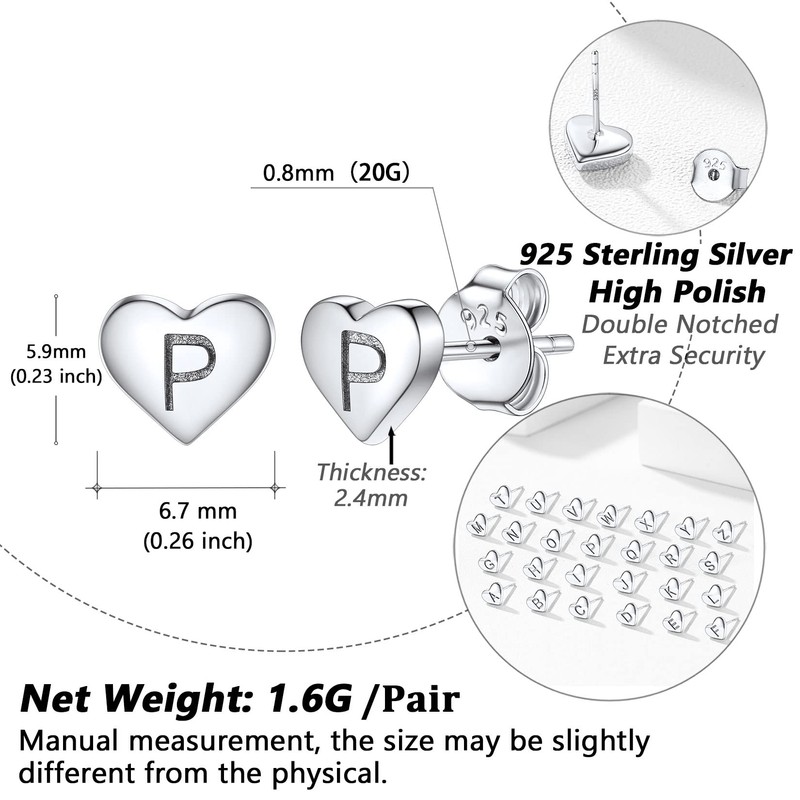 • đź’–Heart Shaped Letter Earrings --- Womens silver initials studs with S925 stamp, allergy-safe, nickle-safe, lead-safe, skin-friendly ear jewellery, earring size: 6.7mm*5.9mm(0.26”inch*0.23”inch), needle size: 0.8mm(20G), weight: 1.6g/pair, really small size and lightweight, comfort fits.